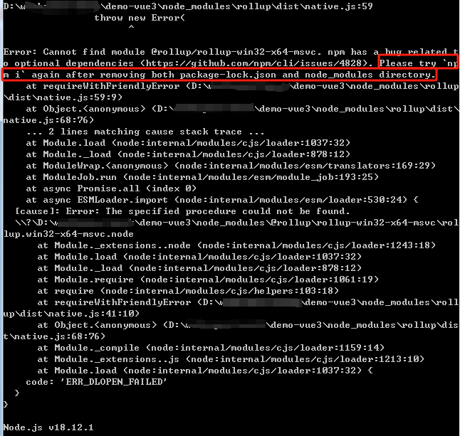 getError:找不到模块@rollup/rollup-win32-x64-msvc。npm有一个与可选依赖项相关的bug(npm/cli#4828). 请在删除package-lock.json和node_modules目录后再次尝试`npm i`。